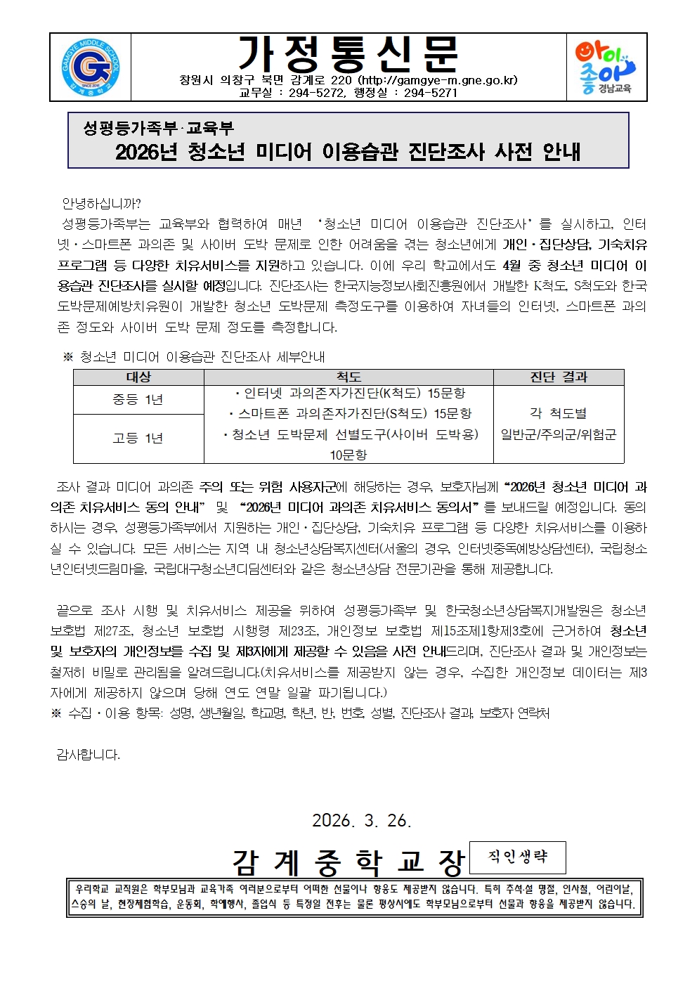 [가정통신문] 2026년 청소년 미디어 이용습관 진단조사 사전 안내(중1학년 대상)